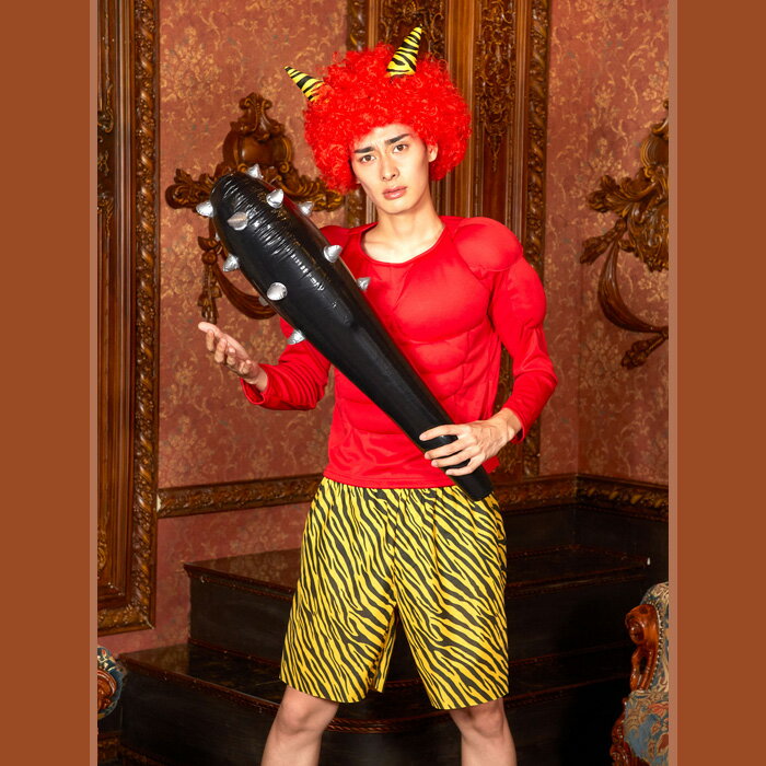≪Halloween costume≫メンズコスプレ 鬼コスチューム赤い角付きウィッグ、トラ柄パンツ、大迫力のどデカこん棒の充実3点セット!大迫力のこん棒はなんと約76cm!組み合わせて誰でも簡単に赤鬼になりきれちゃう♪
