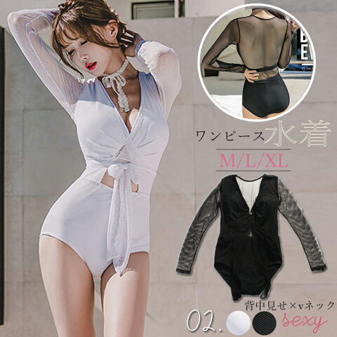 ワンピース水着 レディース 秋冬 長袖 背中開き Vネック リボン パッド ポリエステル